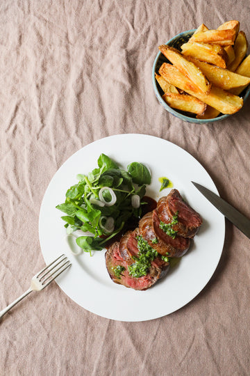 CHATEAUBRIAND, WILD GARLIC, BEEF FAT CHIPS